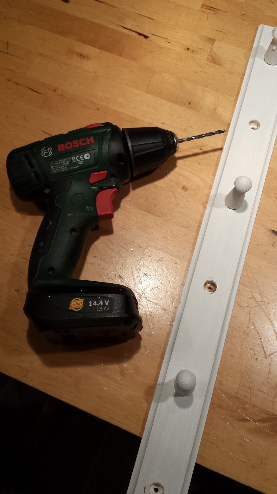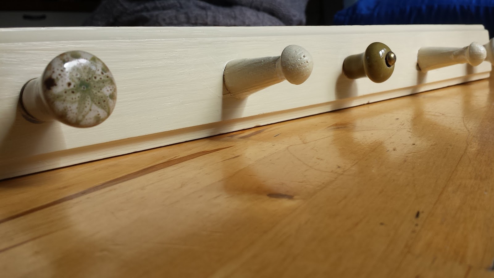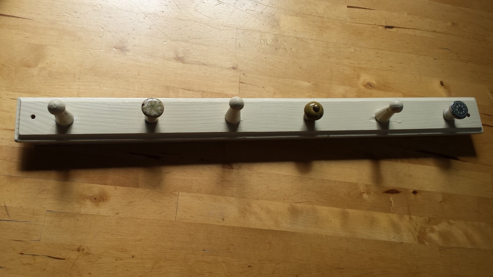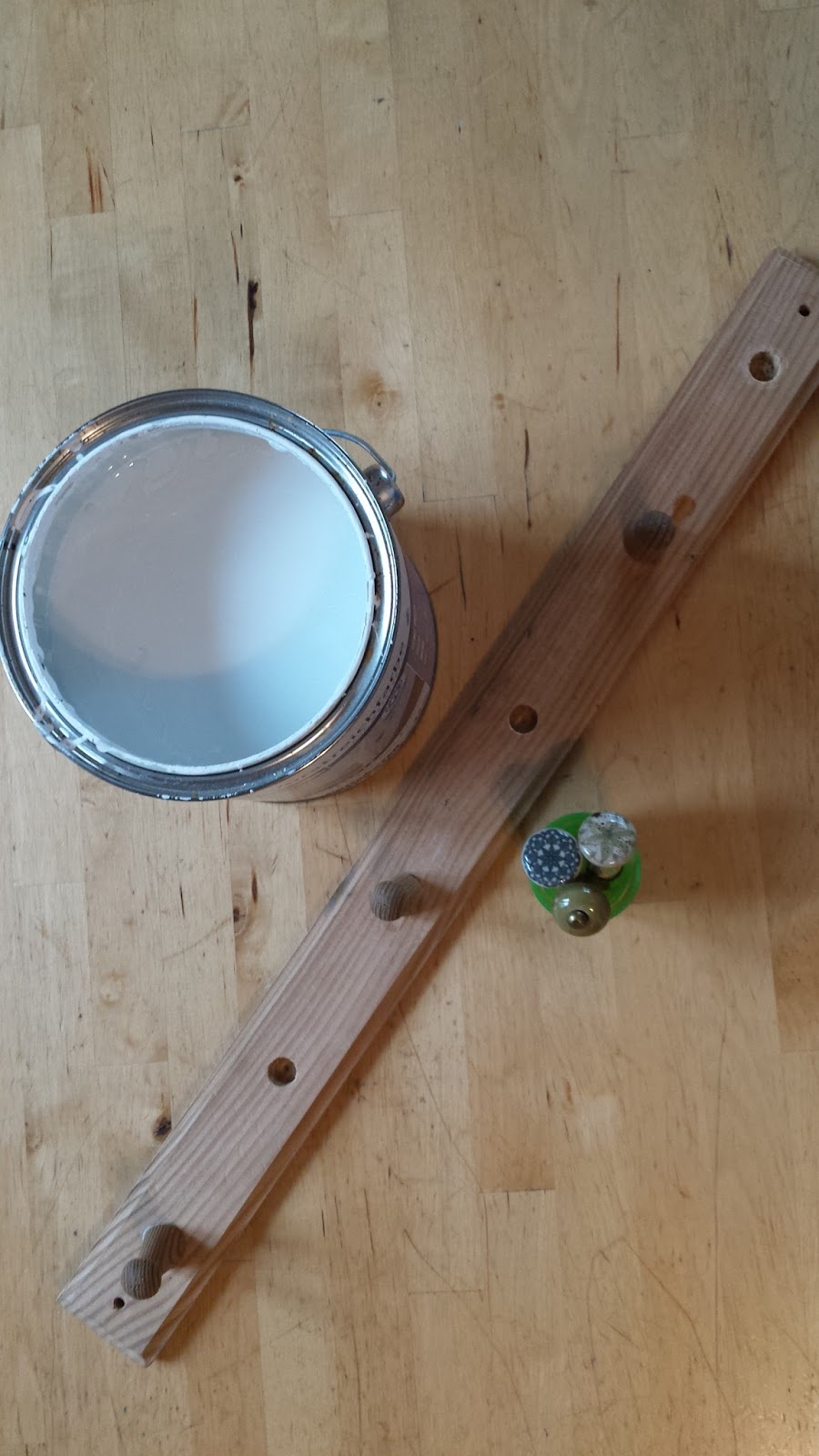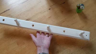 It was the kind of coat rail you can find in any DIY shop for a few quid, made of cheap pine. Of the original six wooden pegs, only four were left. One was very loose. The other three were well secured still. Why bother keeping it? Well, the simple answer is beacuse it might come in handy. The truthful answer is that I cannot accept that something that is not completely irreparable should be dumped because we don't definitely need it right now.