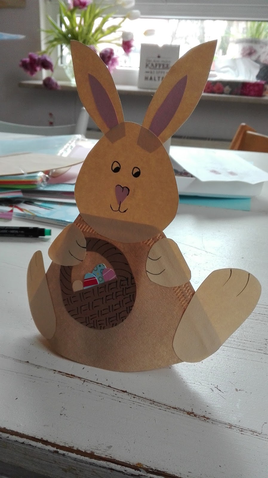 Paper or card in various colours - brown, beige or grey for the rabbit fur, pink or white for inside the ears, brown for the basket and whatever colours you like for the eggs.